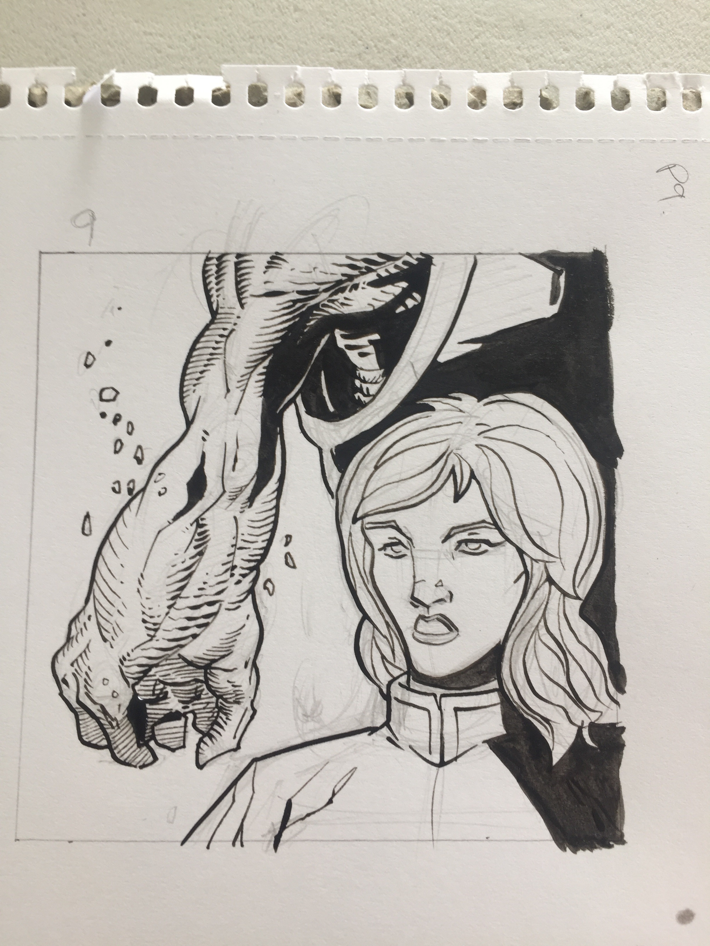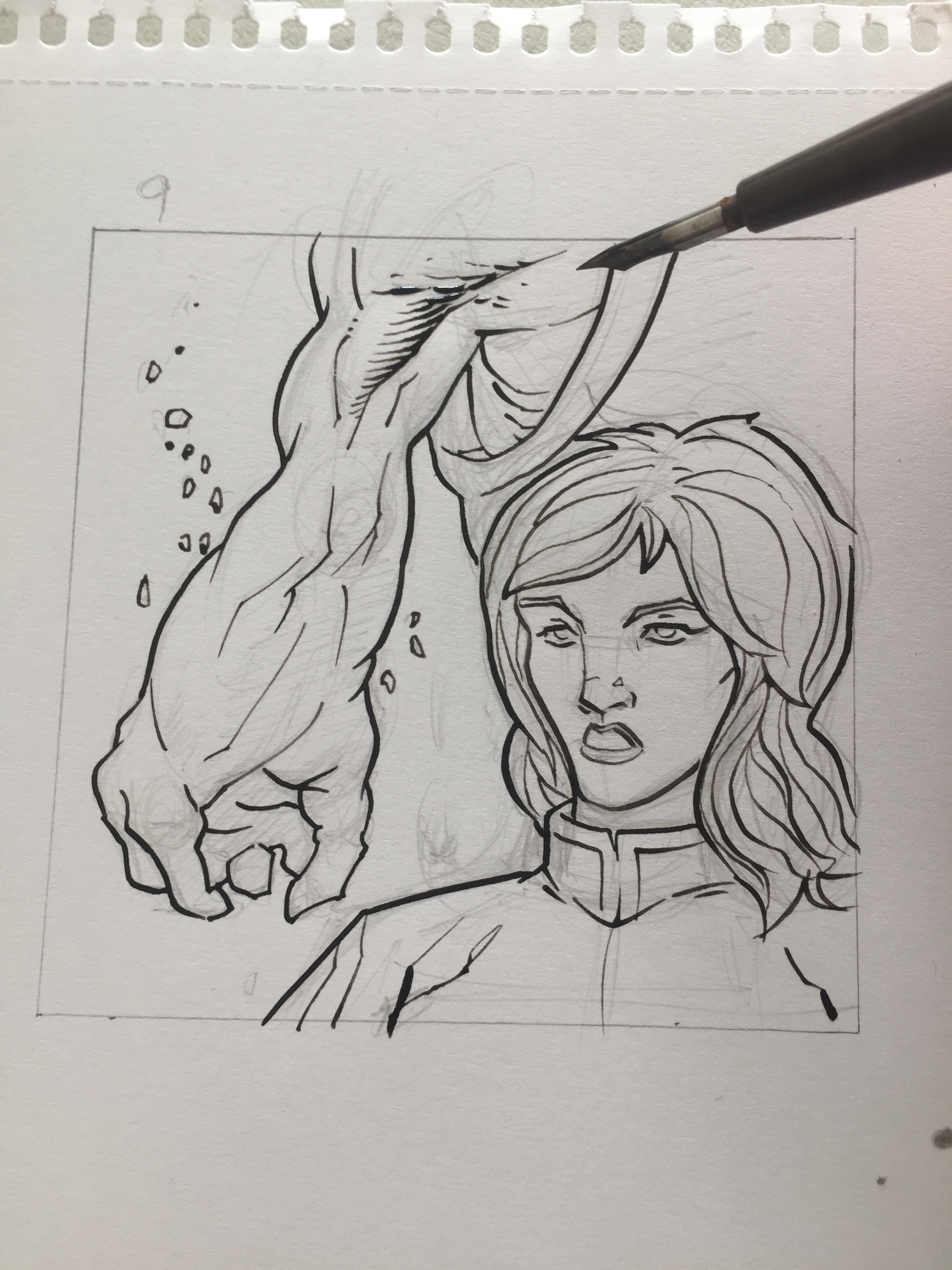 In the creation of the comic Scars of Seven, the inking process starts with outlining the main characters or focal points in each panel. At this stage, the characters look flat and boring.